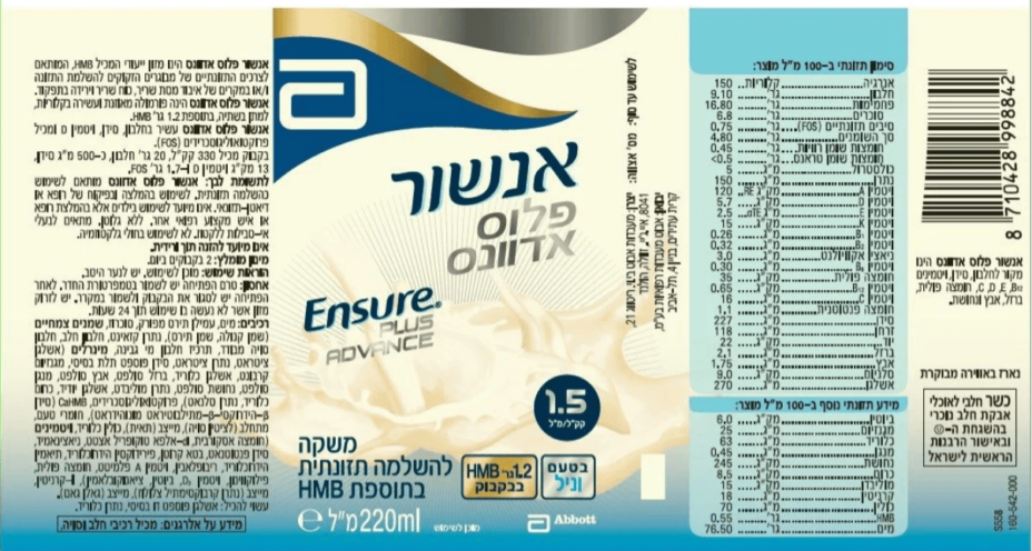 מינון מומלץ 2 בקבוקים ביום. הוראות שימוש : מוכן לשימוש מיידי יש לנער היטב. תנאי אכסון: לאחר פתיחת הבקבוק יש לשמור בטמפרטורת החדר, יש לסגור לאחר הפתיחה ולזרוק את המזון אשר לא נעשה בו שימוש תוך 24 שעות. רכיבים: בבקבוק אנשור פלוס אדוונס קיים מים, עמילן תירס מפורק,סוכרוז,שמנים צמחיים( קנולה ותירס),חלב סויה מבודד,תרכיז חלבון מי גבינה,אשלגן,נתרן, סידן, מגנזיום. לרשימת הרכיבים המלאה יש לעיין בתווית המוצר. מכיל רכיבי חלב וסויה30 יחידות במארז לא ניתן לרכוש בבודדים