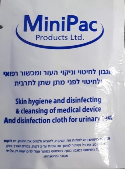 מגבוני חיטוי אישיים המגיע במארז של 60 יחידות מתאים לניקוי וחיטוי העור, מכשור רפואי רישום פנקס אמ"ר 14560401 באישור משרד הבריאות. מוצר על בסיס כלרוצידין אשר מתנדף לאט יותר מאלכוהול וקולט 100 אחוז מהחיידקים.