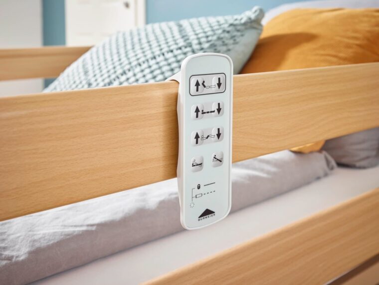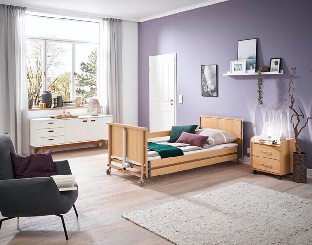 מיטה סיעודית וחשמלית של חברת בורמאייר גרמניה הכוללת מנגנון להרמה והורדה קלה ונוחה עבור המשתמש, מעקות צד, כניסה ויציאה נוחה מהמיטה ובעיצוב נעים למראה החדר.
