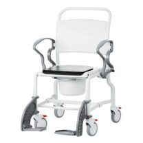 כסא רחצה ושירותים עם גלגלים רחב. לכיסא רגליות פריקות גלגלים אחוריים הכוללים מעצורים ומתאים למשקל כולל של 150 ק"ג.